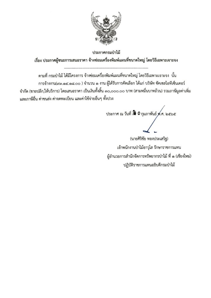 ประกาศกรมป่าไม้ เรื่อง ประกาศผู้ชนะการเสนอราคา จ้างซ่อมเครื่องพิมพ์แผนที่ขนาดใหญ่ โดยวิธีเฉพาะเจาะจง