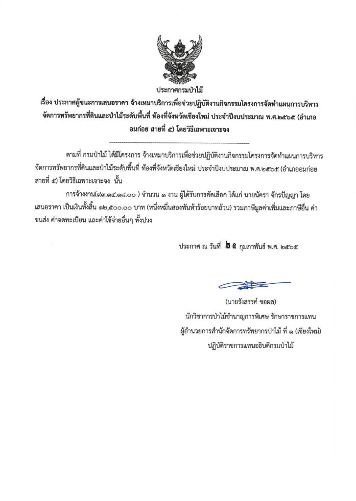 ประกาศกรมป่าไม้ เรื่อง ประกาศผู้ชนะการเสนอราคา จ้างเหมาบริการเพื่อช่วยปฏิบัติงานกิจกรรมโครงการจัดทำแผนการบริหารจัดการทรัพยากรที่ดินและป่าไม้ระดับพื้นที่ ท้องที่จังหวัดเขียงใหม่ ประจำปีงบประมาณ พ.ศ.๒๕๖๕ (อำเภออมก๋อย สายที่ ๕ โดยวิธีเฉพาะเจาะจง24 กุมภาพันธ์ 2022 ใน ประกาศ by adminir