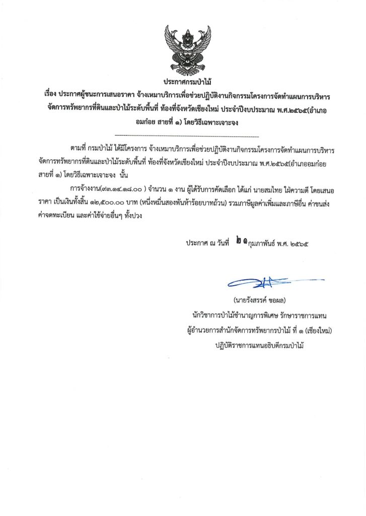 ประกาศกรมป่าไม้ เรื่อง ประกาศผู้ชนะการเสนอราคา จ้างเหมาบริการเพื่อช่วยปฏิบัติงานกิจกรรมโครงการจัดทำแผนการบริหารจัดการทรัพยากรที่ดินและป่าไม้ระดับพื้นที่ ท้องที่จังหวัดเขียงใหม่ ประจำปีงบประมาณ พ.ศ.๒๕๖๕ (อำเภออมก๋อย สายที่ ๑ โดยวิธีเฉพาะเจาะจง24 กุมภาพันธ์ 2022 ใน ประกาศ by adminir