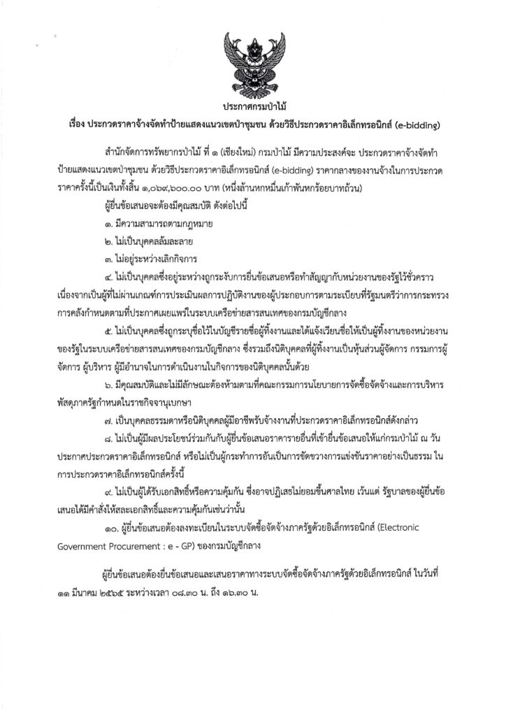 ประกาศกรมป่าไม้ เรื่อง ประกวดราคาจ้างจัดทำป้ายแสดงแนวเขตป่าชุมชน ด้วยวิธีประกวดราคาอิเล็กทรอนิกส์ (e-bidding)3 มีนาคม 2022 ใน ประกาศ by adminir