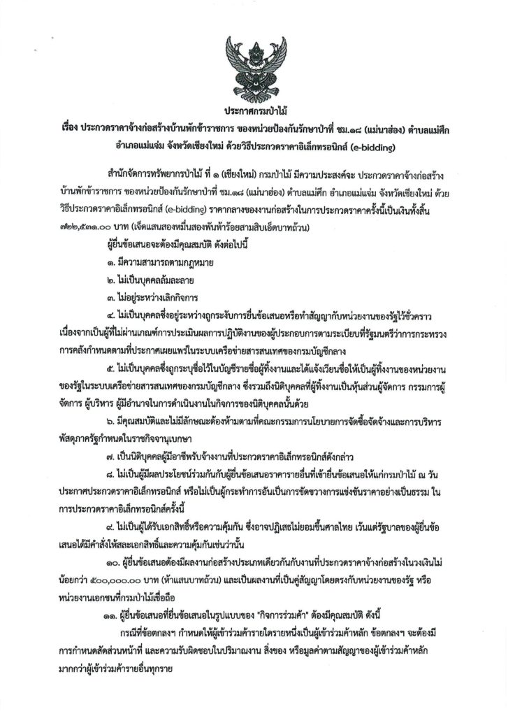 ประกาศกรมป่าไม้ เรื่อง ประกวดราคาจ้างก่อสร้างบ้านพักข้าราชการ ของหน่วยป้องกันรักษาป่าที่ ชม.๑๘ (แม่นาฮ่อง) ตำบลแม่ศึก อำเภอแม่แจ่ม จังหวัดเชียงใหม่ ด้วยวิธีประกวดราคาอิเล็กทรอนิกส์ (e-biddling)3 มีนาคม 2022 ใน ประกาศ by adminir