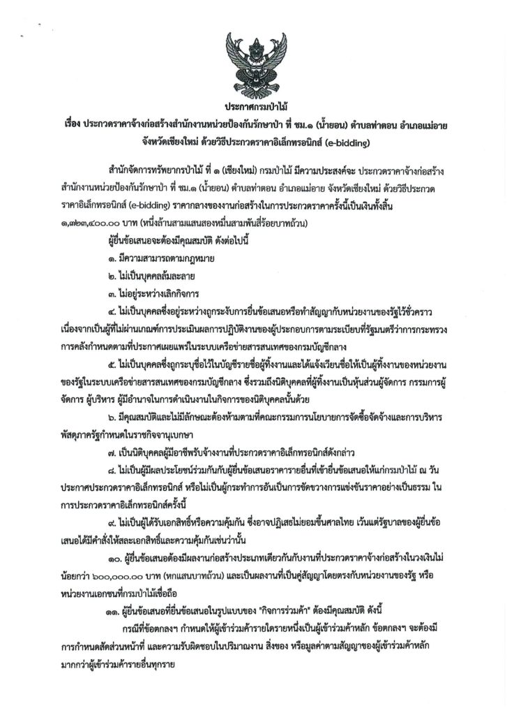 ประกาศกรมป่าไม้ เรื่อง ประกวดราคาจ้างก่อสร้างสำนักงานหน่วยป้องกันรักษาป่า ที่ ชม.๑ (น้ำยอน) ตำบลท่าตอน อำเกอแม่อาย จังหวัดเชียงใหม่ ด้วยวิธีประกวดราคาอิเล็กทรอนิกส์ (e-biddling)3 มีนาคม 2022 ใน ประกาศ by adminir