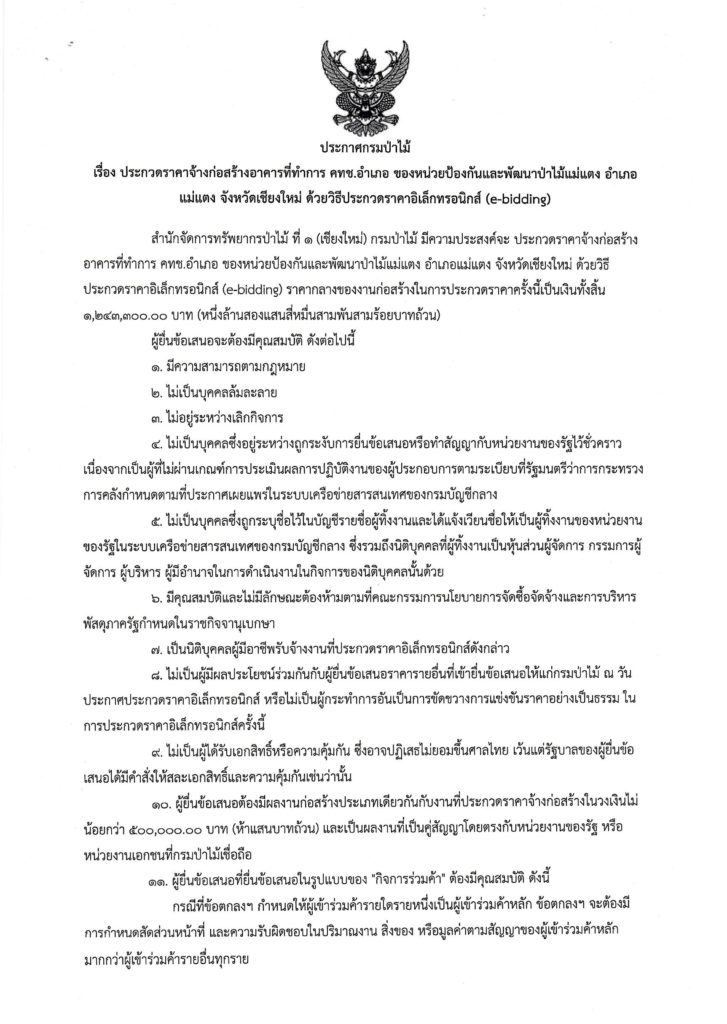 ประกาศกรมป่าไม้ เรื่อง ประกวดราคาจ้างก่อสร้างอาคารที่ทำการ คทช.อำเภอ ของหน่วยป้องกันและพัฒนาป่าไม้แม่แตง อำเภอแม่แตง จังหวัดเชียงใหม่ ด้วยวิธีประกวดราคาอิเล็กทรอนิกส์ (e-bidding)7 มีนาคม 2022 ใน ประกาศ by adminir