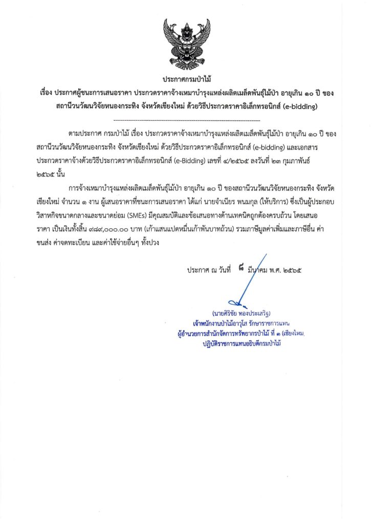 ประกาศกรมป่าไม้ เรื่อง ประกาศผู้ชนะการเสนอราคา ประกวดราคาจ้างเหมาบำรุงแหล่งผลิตเมล็ดพันธุ์ไม้ป่า อายุเกิน 10 ปี ของสถานีวนวัฒนวิจัยหนองกระทิง จังหวัดเชียงใหม่ ด้วยวิธีประกวดราคาอิเล็กทรอนิกส์ (e-bidding)