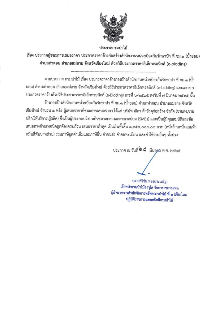 ประกาศกรมป่าไม้ เรื่อง ประกาศผู้ชนะการเสนอราคา ประกวดราคาจ้างก่อสร้างสำนักงานหน่วยป้องกันรักษาป่า ที่ ชม.๑ (น้ำยอน) ตำบลท่าตอน อำเภอแม่อาย จังหวัดเชียงใหม่ ด้วยวิธีประกวดราคาอิเล็กทรอนิกส์ (e-bidding)