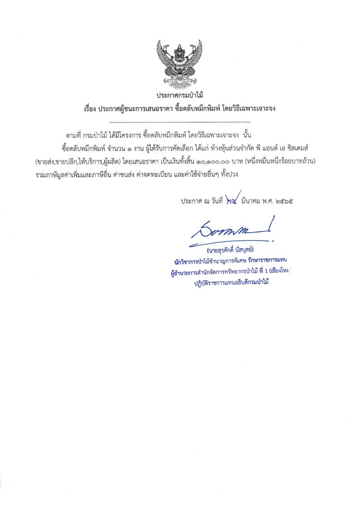 ประกาศกรมป่าไม้ เรื่อง ประกาศผู้ชนะการเสนอราคา ซื้อตลับหมึกพิมพ์ โดยวิธีเฉพาะเจาะจง