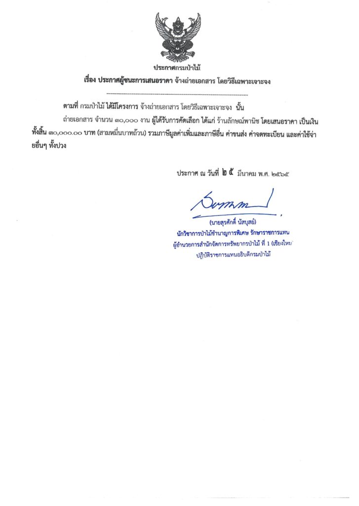 ประกาศกรมป่าไม้ เรื่อง ประกาศผู้ชนะการเสนอราคา จ้างถ่ายเอกสาร โดยวิธีเฉพาะเจาะจง