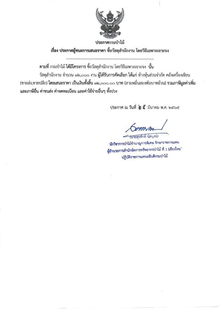 ประกาศกรมป่าไม้ เรื่อง ประกาศผู้ชนะการเสนอราคา ซื้อวัสดุสำนักงาน โดยวิธีเฉพาะเจาะจง26 มีนาคม 2022 ใน ประกาศ by adminir