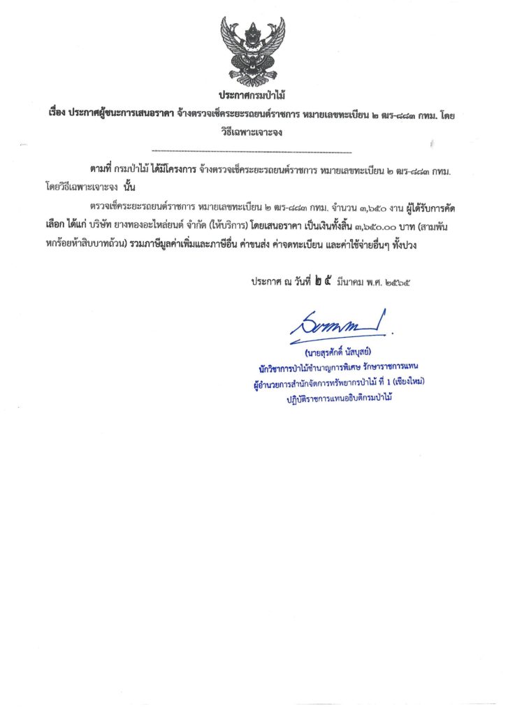 ประกาศกรมป่าไม้ เรื่อง ประกาศผู้ชนะการเสนอราคา จ้างตรวจเช็คระยะรถยนต์ราซการ หมายเลขทะเบียน 2ฒร-883 กทม. โดยวิธีเฉพาะเจาะจง