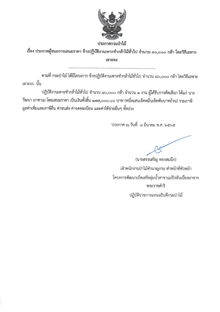 ประกาศกรมป่าไม้ เรื่อง ประกาศผู้ชนะการเสนอราคา จ้างปฏิบัติงานเพาะชำกล้าไม้ทั่วไป จำนวน ๘๐,๐๐๐ กล้า โดยวิธีเฉพาะเจาะจง