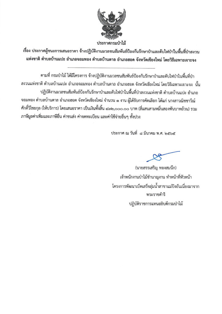 ประกาศกรมป่าไม้ เรื่อง ประกาศผู้ขนะการเสนอราคา จ้างปฏิบัติงานมวลชนสัมพันธ์ป้องกันรักษาป่าและดับไฟป่าในพื้นที่ป่าสงวนแห่งชาติ ตำบลบ้านแปะ อำเภอจอมทอง ตำบลบ้านตาล อำเภอฮอด จังหวัดเชียงใหม่ โดยวิธีเฉพาะเจาะจง5 เมษายน 2022 ใน ประกาศ by adminir