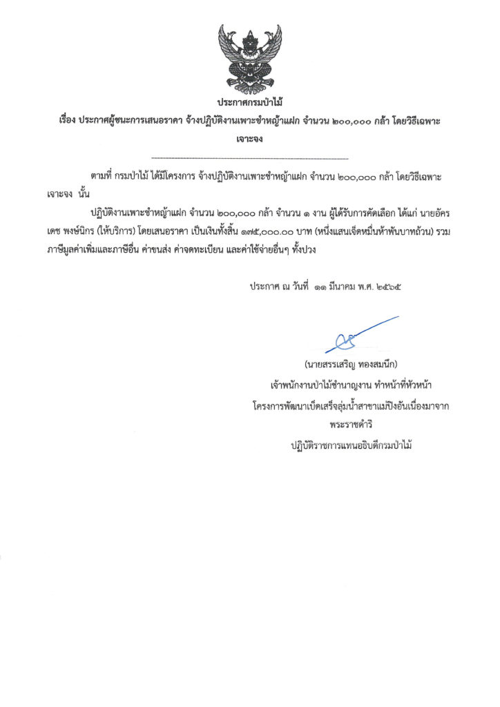 ประกาศกรมป่าไม้ เรื่อง ประกาศผู้ชนะการเสนอราคา จ้างปฏิบัติงานเพาะทำหญ้าแฝก จำนวน ๒๐๐,๐๐๐ กล้า โดยวิธีเฉพาะเจาะจง5 เมษายน 2022 ใน ประกาศ by adminir