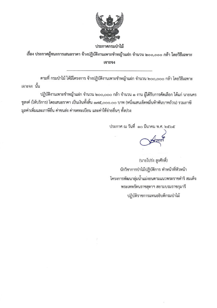 ประกาศกรมป่าไม้ เรื่อง ประกาศผู้ชนะการเสนอราคา จ้างปฏิบัติงานเพาะทำหญ้าแฝก จำนวน ๒๐๐,๐๐๐ กล้า โดยวิธีเฉพาะเจาะจง