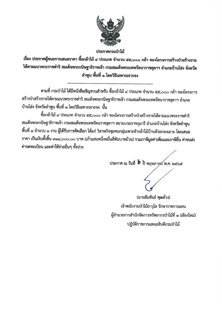 ประกาศกรมป่าไม้ เรื่อง ประกาศผู้ชนะการเสนอราคา ซื้อกล้าไม้ ๔ ประเภท จำนวน ๕๕,๐๐๐ กล้า ของโครงการสร้างป่าสร้างรายได้ตามแนวพระราชดำริ สมเด็จพระกนิษฐาธิราชเจ้า กรมสมเด็จพระเทพรัตนาราชสุดาฯ อำเภอบ้านโฮ่ง จังหวัดลำพูน พื้นที่ ๑ โดยวิธีเฉพาะเจาะจง26 พฤษภาคม 2022 ใน ประกาศ by adminir