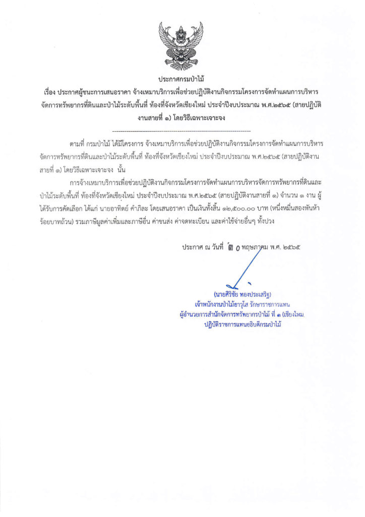 ประกาศกรมป่าไม้ เรื่อง ประกาศผู้ชนะการเสนอราคา จ้างเหมาบริการเพื่อช่วยปฏิบัติงานกิจกรรมโครงการจัดทำแผนการบริหาร จัดการทรัพยากรที่ดินและป่าไม้ระดับพื้นที่ ท้องที่จังหวัดเชียงใหม่ ประจำปีงบประมาณ พ.ศ.๒๕๖๕ (สายปฏิบัติงานสายที่ ๑) โดยวิธีเฉพาะเจาะจง30 พฤษภาคม 2022 ใน ประกาศ by adminir