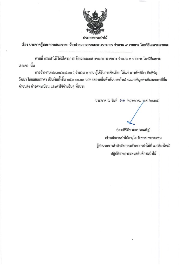 ประกาศกรมป่าไม้ เรื่อง ประกาศผู้ชนะการเสนอราคา จ้างถ่ายเอกสารของทางราชการ จำนวน ๔ รายการ โดยวิธีเฉพาะเจาะจง31 พฤษภาคม 2022 ใน ประกาศ by adminir