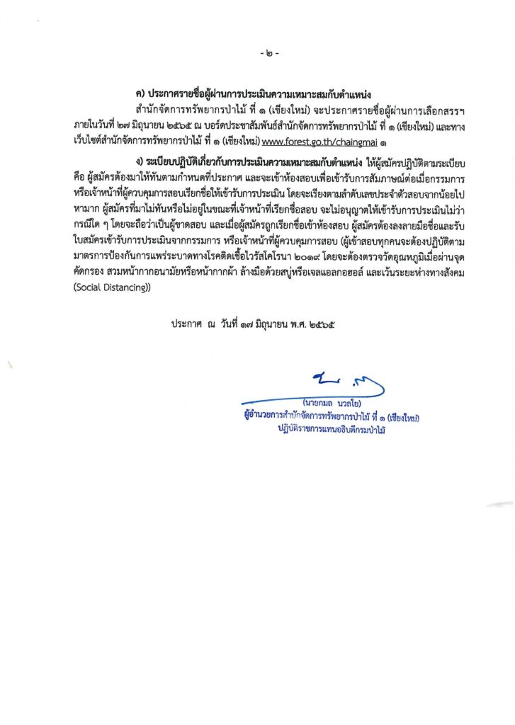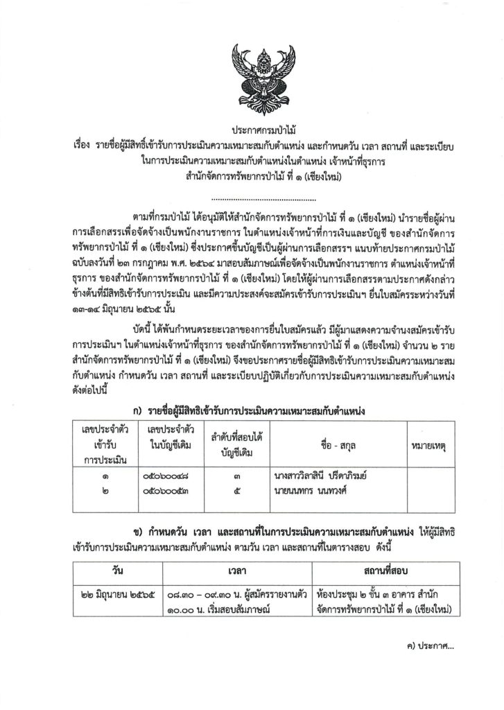 หน้าแรก » ประกาศ » ประกาศกรมป่าไม้ เรื่อง รายชื่อผู้มีสิทธิ์เข้ารับการประเมินความเหมาะสมกับตำแหน่ง และกำหนดวัน เวลา สถานที่ และระเบียบในการประเมินความเหมาะสมกับตำแหน่งในตำแหน่ง เจ้าหน้าที่ธุรการ สำนักจัดการทรัพยากรป่าไม้ ที่ 1 (เชียงใหม่)