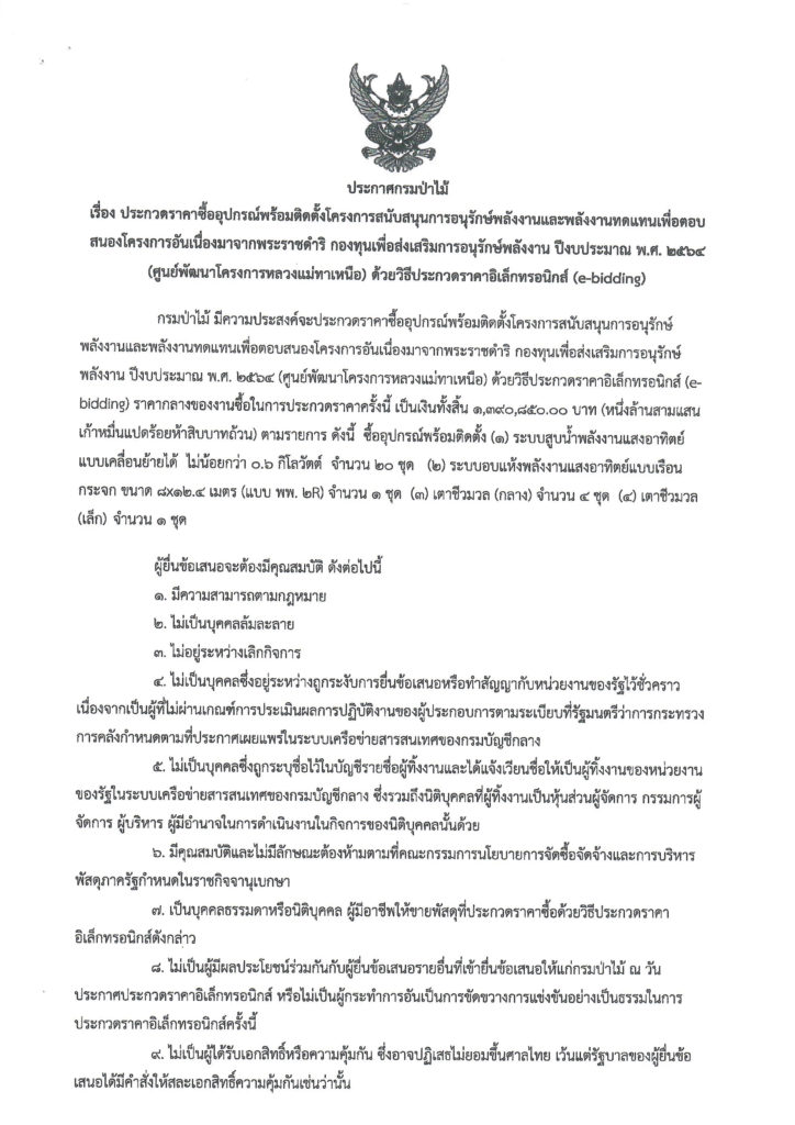 หน้าแรก » ประกาศ » ประกาศกรมป่าไม้ เรื่อง ประกวดราคาซื้ออุปกรณ์พร้อมติดตั้งโครงการสนับสนุนการอนุรักษ์พลังงานและพลังงานทดแทนเพื่อตอบ สนองโครงการอันเนื่องมาจากพระราชดำริ กองทุนเพื่อส่งเสริมการอนุรักษ์พลังงาน ปีงบประมาณ พ.ศ. ๒๕๖๔ (ศูนย์พัฒนาโครงการหลวงแม่ทาเหนือ) ด้วยวิธีประกวดราคาอิเล็กทรอนิกส์ (e-bidding)