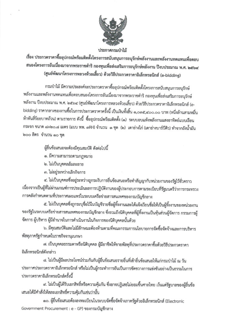 หน้าแรก » ประกาศ » ประกาศกรมป่าไม้ เรื่อง ประกวดราคาซื้ออุปกรณ์พร้อมติดตั้งโครงการสนับสนุนการอนุรักษ์พลังงานและพลังงานทดแทนเพื่อตอบ สนองโครงการอันเนื่องมาจากพระราชดำริ กองทุนเพื่อส่งเสริมการอนุรักษ์พลังงาน ปีงบประมาณ พ.ศ. ๒๕๖๔ (ศูนย์พัฒนาโครงการหลวงห้วยเสี้ยว) ด้วยวิธีประกวดราคาอิเล็กทรอนิกส์ (e-bidding)