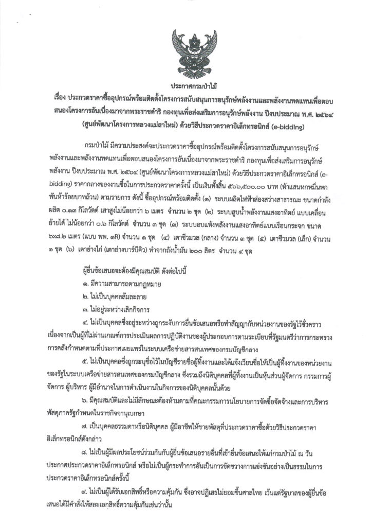 หน้าแรก » ประกาศ » ประกาศกรมป่าไม้ เรื่อง ประกวดราคาซื้ออุปกรณ์พร้อมติดตั้งโครงการสนับสนุนการอนุรักษ์พลังงานและพลังงานทดแทนเพื่อตอบ สนองโครงการอันเนื่องมาจากพระราชดำริ กองทุนเพื่อส่งเสริมการอนุรักษ์พลังงาน ปีงบประมาณ พ.ศ. ๒๕๖๔ (ศูนย์พัฒนาโครงการหลวงแม่สาใหม่) ด้วยวิธีประกวดราคาอิเล็กทรอนิกส์ (e-bidding)