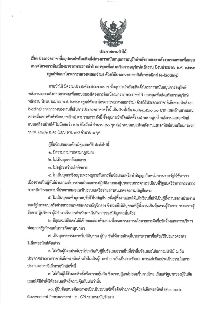 หน้าแรก » ประกาศ » ประกาศกรมป่าไม้ เรื่อง ประกวดราคาซื้ออุปกรณ์พร้อมติดตั้งโครงการสนับสนุนการอนุรักษ์พลังงานและพลังงานทดแทนเพื่อตอบสนองโครงการอันเนื่องมาจากพระราชดำริ กองทุนเพื่อส่งเสริมการอนุรักษ์พลังงาน ปีงบประมาณ พ.ศ. ๒๕๖๔ (ศูนย์พัฒนาโครงการหลวงหมอกจ๋าม) ด้วยวิธีประกวดราคาอิเล็กทรอนิกส์ (e-bidding)