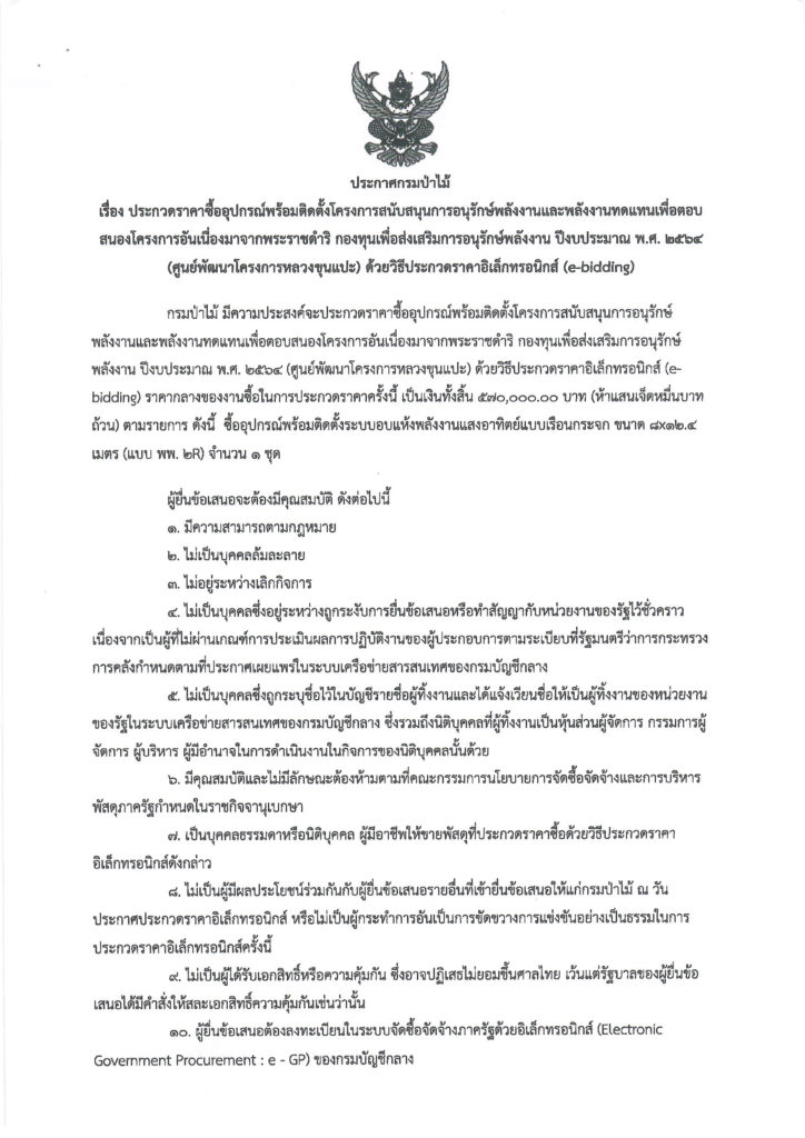 หน้าแรก » ประกาศ » ประกาศกรมป่าไม้ เรื่อง ประกวดราคาซื้ออุปกรณ์พร้อมติดตั้งโครงการสนับสนุนการอนุรักษ์พลังงานและพลังงานทดแทนเพื่อตอบสนองโครงการอันเนื่องมาจากพระราชดำริ กองทุนเพื่อส่งเสริมการอนุรักษ์พลังงาน ปีงบประมาณ พ.ศ. ๒๕๖๔ (ศูนย์พัฒนาโครงการหลวงขุนแปะ ด้วยวิธีประกวดราคาอิเล็กทรอนิกส์ (e-bidding)
