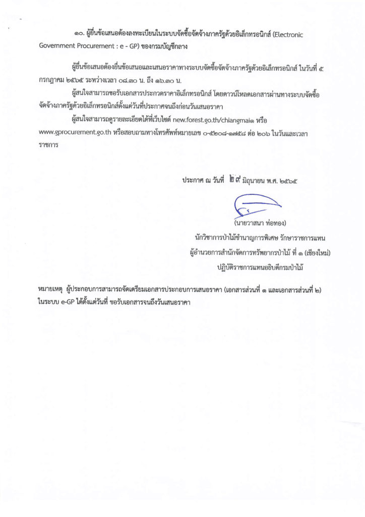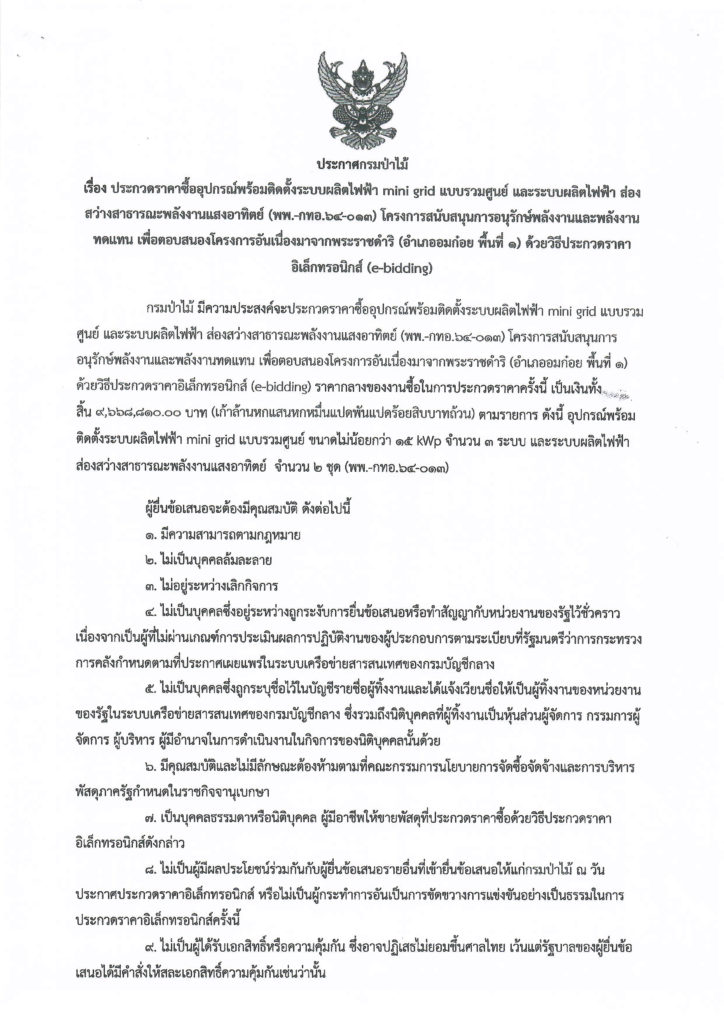 ประกาศกรมป่าไม้ เรื่อง ประกวดราคาซื้ออุปกรณ์พร้อมติดตั้งระบบผลิตไฟฟ้า mini grid แบบรวมศูนย์ และระบบผลิตไฟฟ้า ส่องสว่างสาธารณะพลังงานแสงอาทิตย์ (พพ.-กทอ.๖๔-๐๑๓) โครงการสนับสนุนการอนุรักษ์พลังงานและพลังงานทดแทน เพื่อตอบสนองโครงการอันเนื่องมาจากพระราชดำริ (อำเภออมก๋อย พื้นที่ ๑) ด้วยวิธีประกวดราคาอิเล็กทรอนิกส์ (e-bidding)