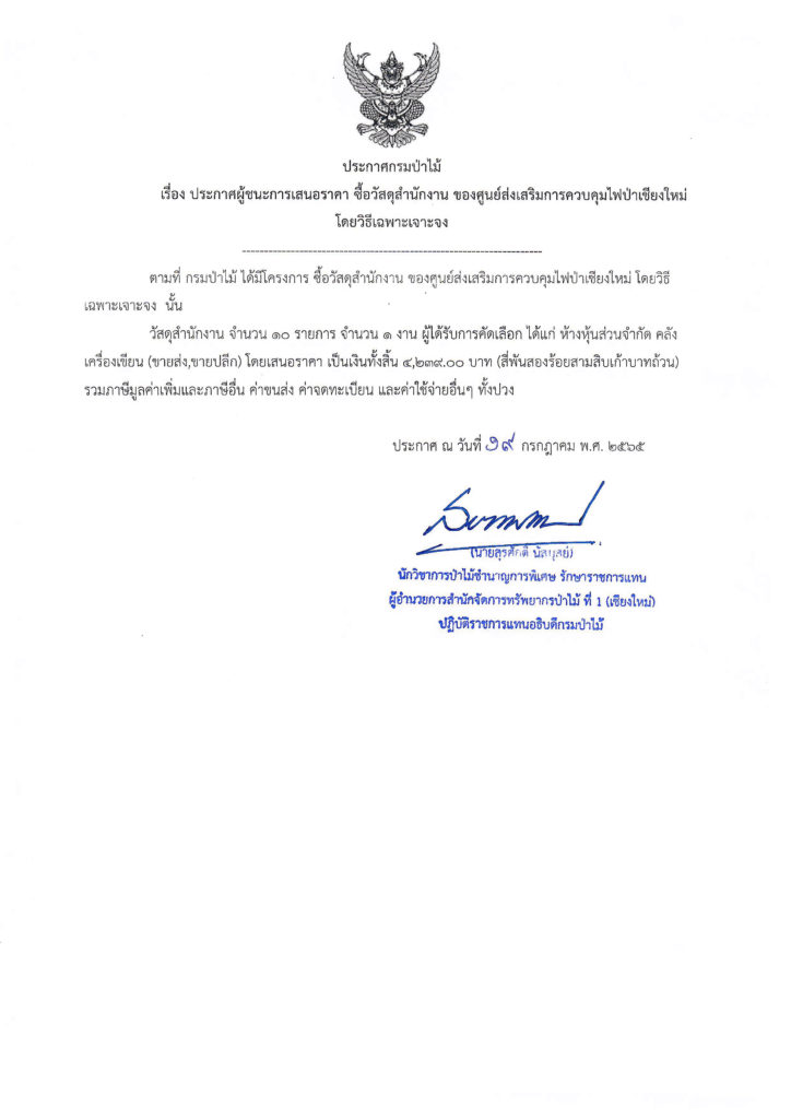 ประกาศกรมป่าไม้ เรื่อง ประกาศผู้ชนะการเสนอราคา ซื้อวัสดุสำนักงาน ของศูนย์ส่งเสริมการควบคุมไฟป่าเชียงใหม่ โดยวิธีเฉพาะเจาะจง19 กรกฎาคม 2022 ใน ประกาศ by adminir