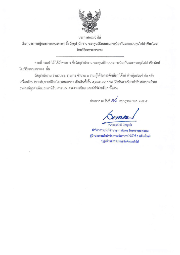 ประกาศกรมป่าไม้ เรื่อง ประกาศผู้ชนะการเสนอราคา ซื้อวัสดุสำนักงาน ของศูนย์ฝึกอบรมการป้องกันและควบคุมไฟป่าเชียงใหม่ โดยวิธีเฉพาะเจาะจง19 กรกฎาคม 2022 ใน ประกาศ by adminir