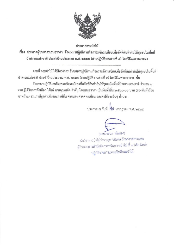 ประกาศกรมป่าไม้ เรื่อง ประกาศผู้ชนะการเสนอราคา จ้างเหมาปฏิบัติงานกิจกรรมจัดระเบียบเพื่อจัดที่ดินทำกินให้ชุมชนในพื้นที่ป่าสงวนแห่งชาติ ประจำปีงบประมาณ พ.ศ. ๒๕๖๕ (สายปฏิบัติงานสายที่ ๓) โดยวิธีเฉพาะเจาะจง