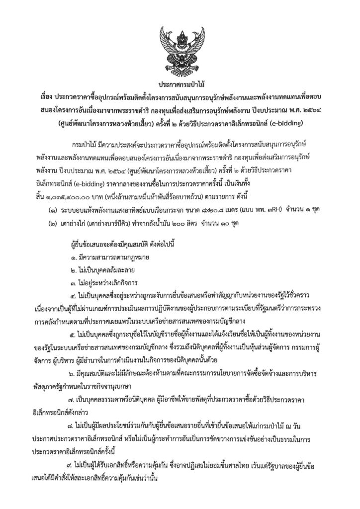 หน้าแรก » ประกาศ » ประกาศกรมป่าไม้ เรื่อง ประกวดราคาซื้ออุปกรณ์พร้อมติดตั้งโครงการสนับสนุนการอนุรักษ์พลังงานและพลังงานทดแทนเพื่อตอบสนองโครงการอันเนื่องมาจากพระราชดำริ กองทุนเพื่อส่งเสริมการอนุรักษ์พลังงาน ปีงบประมาณ พ.ศ. ๒๕๖๔ (ศูนย์พัฒนาโครงการหลวงห้วยเสี้ยว) ครั้งที่ ๒ ด้วยวิธีประกวดราคาอิเล็กทรอนิกส์ (e-biddling)