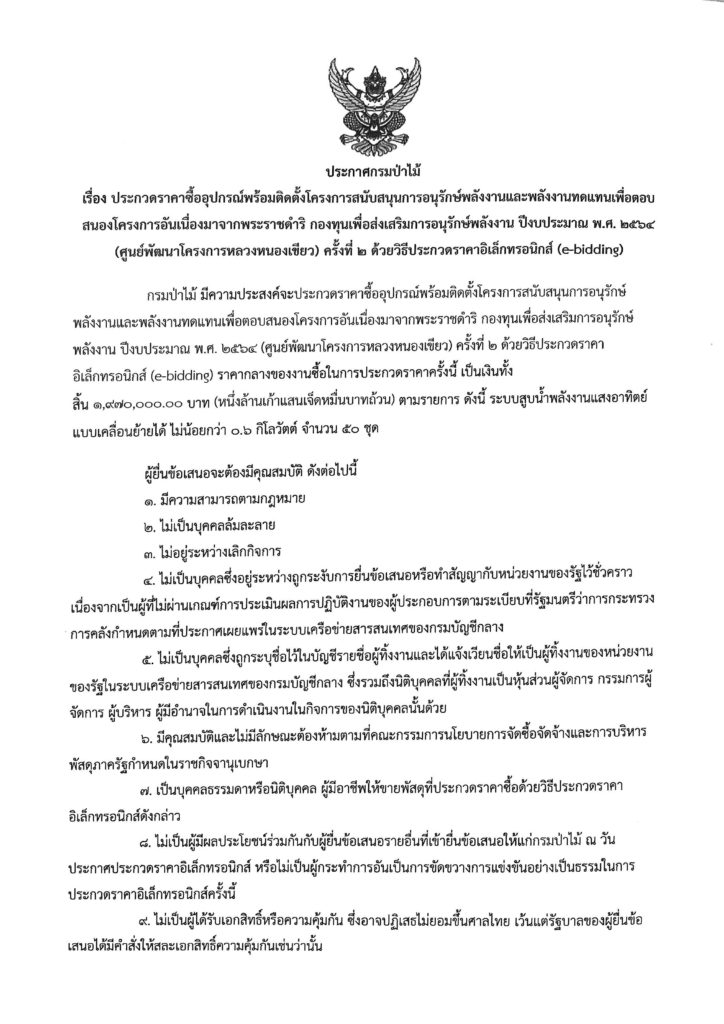 หน้าแรก » ประกาศจัดซื้อจัดจ้าง » ประกาศกรมป่าไม้ เรื่อง ประกวดราคาซื้ออุปกรณ์พร้อมติดตั้งโครงการสนับสนุนการอนุรักษ์พลังงานและพลังงานทดแทนเพื่อตอบสนองโครงการอันเนื่องมาจากพระราชดำริ กองทุนเพื่อส่งเสริมการอนุรักษ์พลังงาน ปีงบประมาณ พ.ศ. ๒๕๖๔ (ศูนย์พัฒนาโครงการหลวงหนองเขียว) ครั้งที่ ๒ ด้วยวิธีประกวดราคาอิเล็กทรอนิกส์ (e-bidding)
