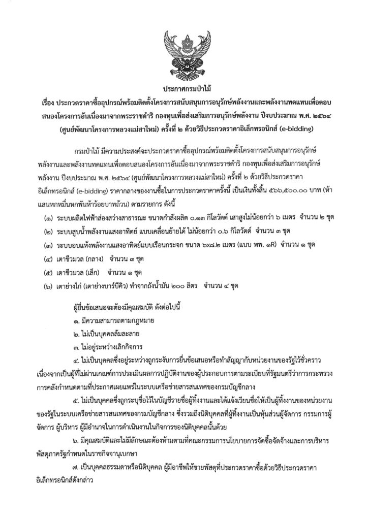 หน้าแรก » ประกาศจัดซื้อจัดจ้าง » ประกาศกรมป่าไม้ เรื่อง ประกวดราคาซื้ออุปกรณ์พร้อมติดตั้งโครงการสนับสนุนการอนุรักษ์พลังงานและพลังงานทดแทนเพื่อตอบสนองโครงการอันเนื่องมาจากพระราชดำริ กองทุนเพื่อส่งเสริมการอนุรักษ์พลังงาน ปีงบประมาณ พ.ศ. ๒๕๖๔ (ศูนย์พัฒนาโครงการหลวงแม่สาใหม่) ครั้งที่ ๒ ด้วยวิธีประกวดราคาอิเล็กทรอนิกส์ (e-bidding)