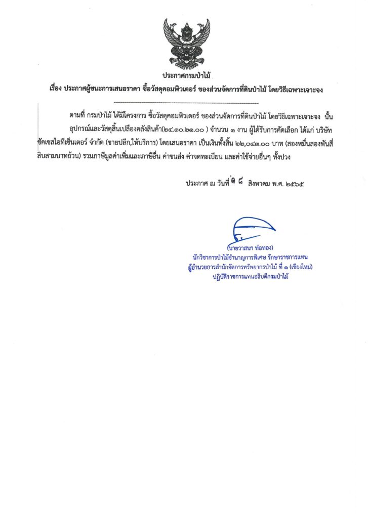 ประกาศกรมป่าไม้ เรื่อง ประกาศผู้ชนะการเสนอราคา ซื้อวัสดุคอมพิวเตอร์ ของส่วนจัดการที่ดินป่าไม้ โดยวิธีเฉพาะเจาะจง19 สิงหาคม 2022 ใน ประกาศ by adminir