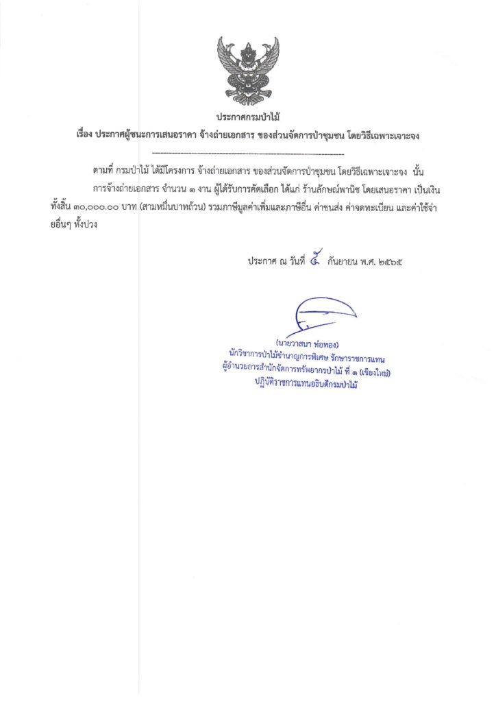 ประกาศกรมป่าไม้ เรื่อง ประกาศผู้ชนะการเสนอราคา จ้างถ่ายเอกสาร ของส่วนจัดการป่าชุมขน โดยวิธีเฉพาะเจาะจง5 กันยายน 2022 ใน ประกาศจัดซื้อจัดจ้าง by adminir