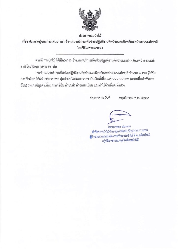 ประกาศกรมป่าไม้ เรื่อง ประกาศผู้ชนะการเสนอราคา จ้างเหมาบริการเพื่อช่วยปฏิบัติงานติดป้ายและฝังหลักเขตป่าสงวนแห่งชาติ โดยวิธีเฉพาะเจาะจง30 พฤศจิกายน 2022 ใน ประกาศจัดซื้อจัดจ้าง by adminir