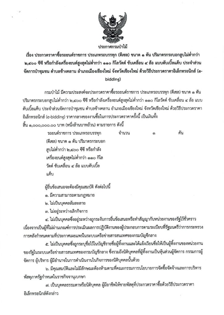 หน้าแรก » ประกาศจัดซื้อจัดจ้าง » ประกาศกรมป่าไม้ เรื่อง ประกวดราคาซื้อรถยนต์ราชการ ประเภทรถบรรทุก (ดีเซล) ขนาด 1 ตัน ปริมาตรกระบอกสูบไม่ต่ำกว่า 2,400 ซีซี หรือกำลังเครื่องยนต์สูงสุดไม่ต่ำกว่า 110 กิโลวัตต์ ขับเคลื่อน 4 ล้อ แบบดับเบิ้ลแค็บ ประจำส่วนจัดการป่าชุมชน ตำบลช้างคลาน อำเภอเมืองเชียงใหม่ จังหวัดเชียงใหม่ ด้วยวิธีประกวดราคาอิเล็กทรอนิกส์ (e-bidding)