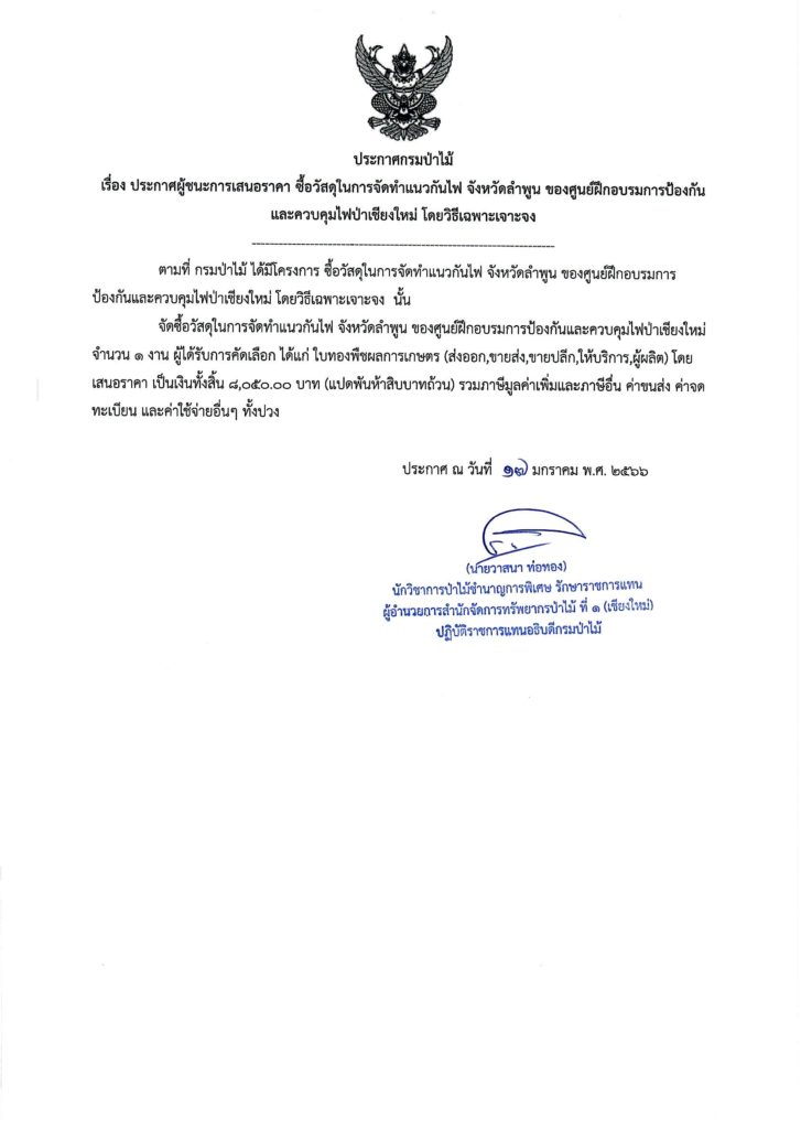 ประกาศกรมป่าไม้ เรื่อง ประกาศผู้ชนะการเสนอราคา ซื้อวัสดุในการจัดทำแนวกันไฟ จังหวัดลำพูน ของศูนย์ฝึกอบรมการป้องกันและควบคุมไฟป่าเชียงใหม่ โดยวิธีเฉพาะเจาะจง17 มกราคม 2023 ใน ประกาศจัดซื้อจัดจ้าง by adminir