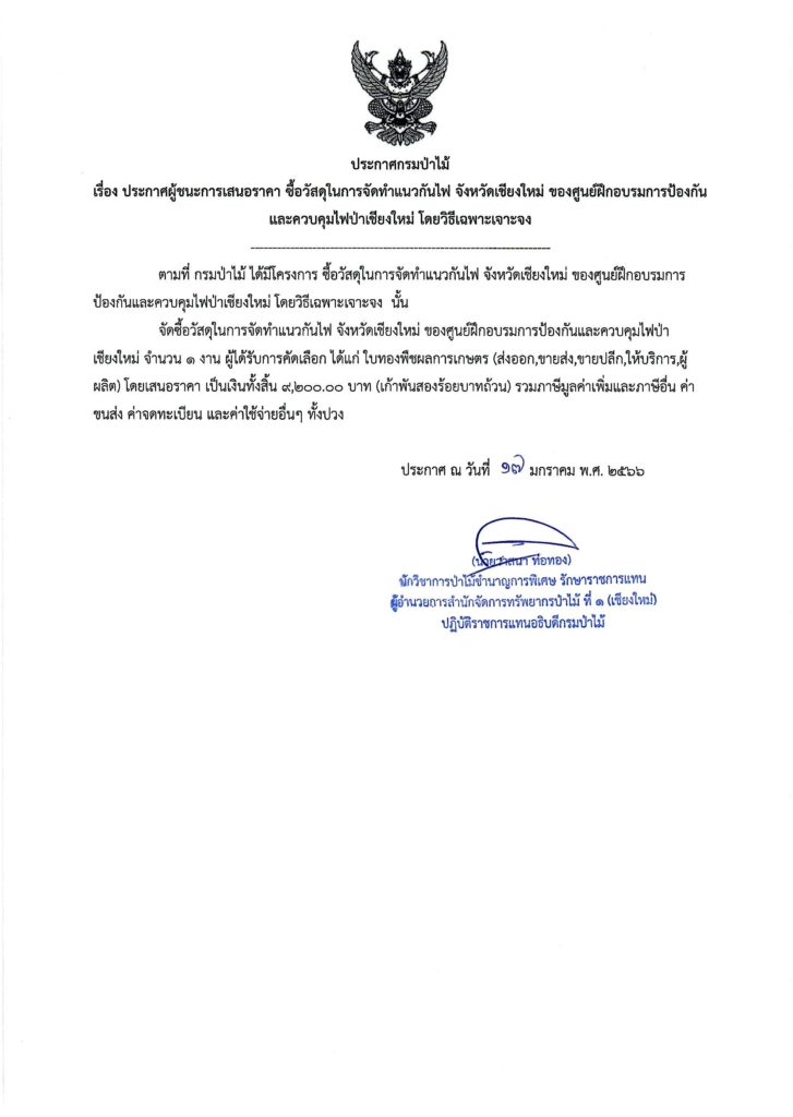 ประกาศกรมป่าไม้ เรื่อง ประกาศผู้ชนะการเสนอราคา ซื้อวัสดุในการจัดทำแนวกันไฟ จังหวัดเชียงใหม่ ของศูนย์ฝึกอบรมการป้องกันและควบคุมไฟป่าเชียงใหม่ โดยวิธีเฉพาะเจาะจง17 มกราคม 2023 ใน ประกาศจัดซื้อจัดจ้าง by adminir