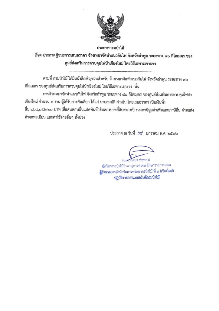 ประกาศกรมป่าไม้ เรื่อง ประกาศผู้ชนะการเสนอราคา จ้างเหมาจัดทำแนวกันไฟ จังหวัดลำพูน ระยะทาง ๙๐ กิโลเมตร ของ ศูนย์ส่งเสริมการควบคุมไฟป่าเชียงใหม่ โดยวิธีเฉพาะเจาะจง19 มกราคม 2023 ใน ประกาศจัดซื้อจัดจ้าง by adminir