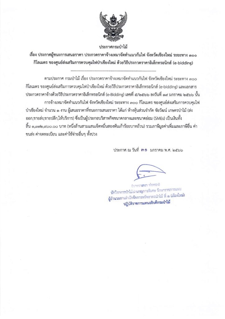 ประกาศกรมป่าไม้ เรื่อง ประกาศผู้ชนะการเสนอราคา ประกวดราคาจ้างเหมาจัดทำแนวกันไฟ จังหวัดเชียงใหม่ ระยะทาง ๓๐๐กิโลเมตร ของศูนย์ส่งเสริมการควบคุมไฟป่าเชียงใหม่ ด้วยวิธีประกวดราคาอิเล็กทรอนิกส์ (e-bidding)31 มกราคม 2023 ใน ประกาศจัดซื้อจัดจ้าง by adminir