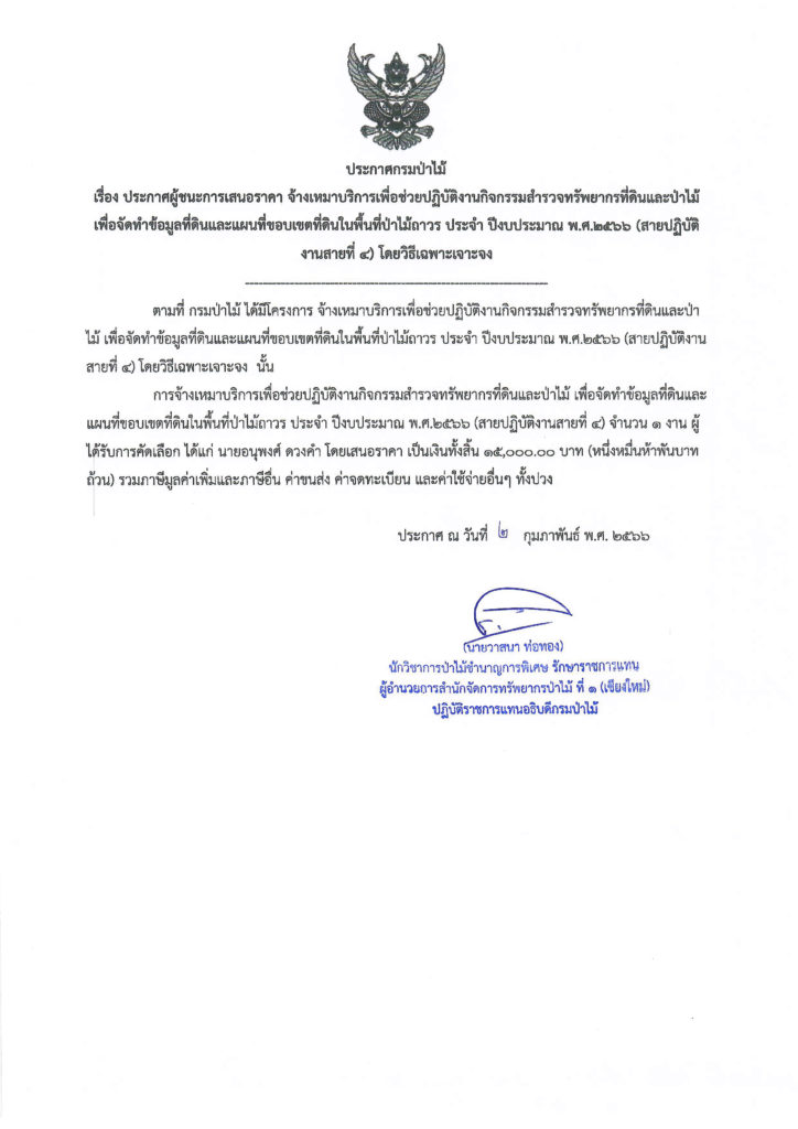 ประกาศกรมป่าไม้ เรื่อง ประกาศผู้ชนะการเสนอราคา จ้างเหมาบริการเพื่อช่วยปฏิบัติงานกิจกรรมสำรวจทรัพยากรที่ดินและป่าไม้เพื่อจัดทำข้อมูลที่ดินและแผนที่ขอบเขตที่ดินในพื้นที่ป่าไม้ถาวร ประจำ ปีงบประมาณ พ.ศ.๒๕๖๖ (สายปฏิบัติงานสายที่ ๔) โดยวิธีเฉพาะเจาะจง3 กุมภาพันธ์ 2023 ใน ประกาศจัดซื้อจัดจ้าง by adminir