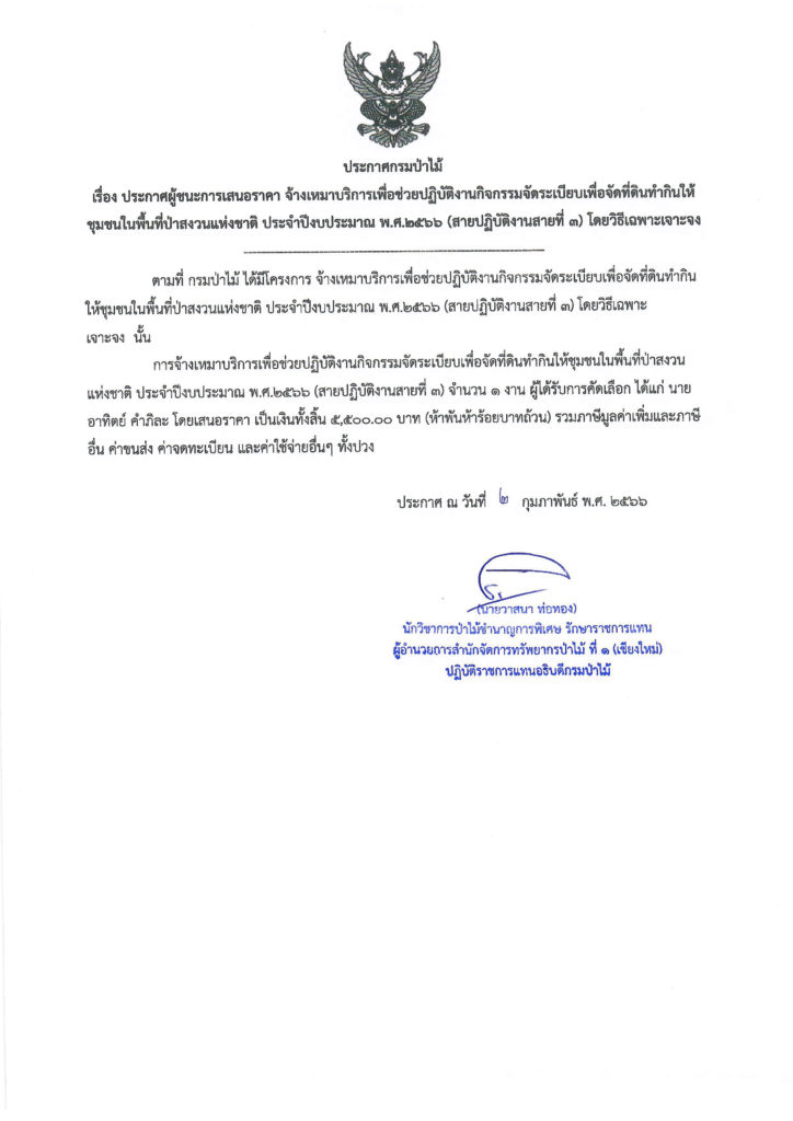 ประกาศกรมป่าไม้ เรื่อง ประกาศผู้ชนะการเสนอราคา จ้างเหมาบริการเพื่อช่วยปฏิบัติงานกิจกรรมจัดระเบียบเพื่อจัดที่ดินทำกินให้ชุมชนในพื้นที่ป่าสงวนแห่งชาติ ประจำปีงบประมาณ พ.ศ.๒๕๖๖ (สายปฏิบัติงานสายที่ ๓) โดยวิธีเฉพาะเจาะจง3 กุมภาพันธ์ 2023 ใน ประกาศจัดซื้อจัดจ้าง by adminir