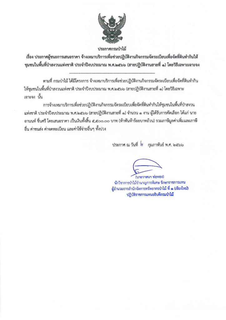 ประกาศกรมป่าไม้ เรื่อง ประกาศผู้ชนะการเสนอราคา จ้างเหมาบริการเพื่อช่วยปฏิบัติงานกิจกรรมจัดระเบียบเพื่อจัดที่ดินทำกินให้ชุมชนในพื้นที่ป่าสงวนแห่งชาติ ประจำปีงบประมาณ พ.ศ.๒๕๖๖ (สายปฏิบัติงานสายที่ ๑) โดยวิธีเฉพาะเจาะจง3 กุมภาพันธ์ 2023 ใน ประกาศจัดซื้อจัดจ้าง by adminir