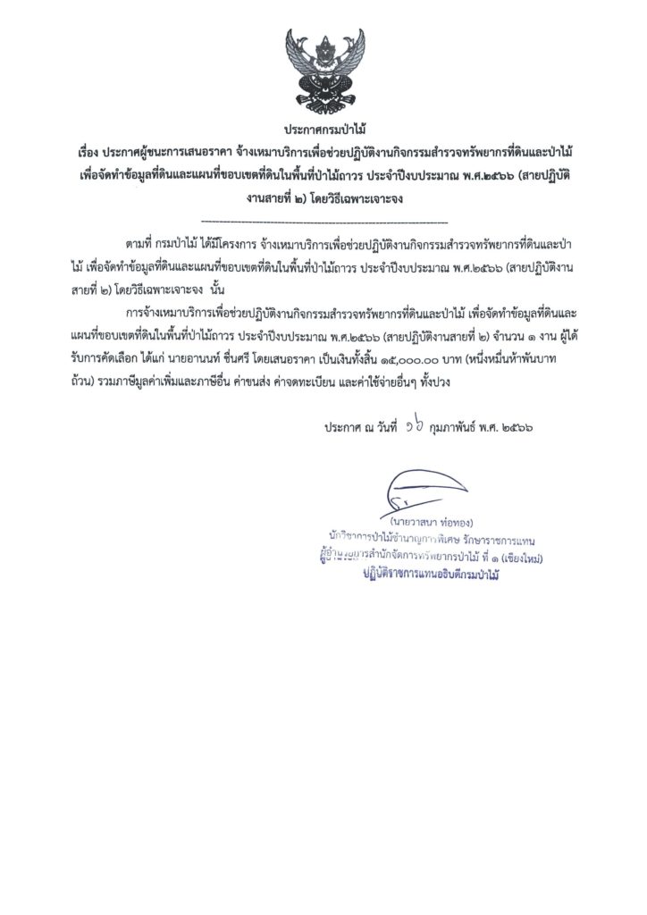 ประกาศกรมป่าไม้ เรื่อง ประกาศผู้ชนะการเสนอราคา จ้างเหมาบริการเพื่อช่วยปฏิบัติงานกิจกรรมสำรวจทรัพยากรที่ดินและป่าไม้เพื่อจัดทำข้อมูลที่ดินและแผนที่ขอบเขตที่ดินในพื้นที่ป่าไม้ถาวร ประจำปีงบประมาณ พ.ศ.2566 (สายปฏิบัติงานสายที่ 2) โดยวิธีเฉพาะเจาะจง16 กุมภาพันธ์ 2023 ใน ประกาศจัดซื้อจัดจ้าง by adminir