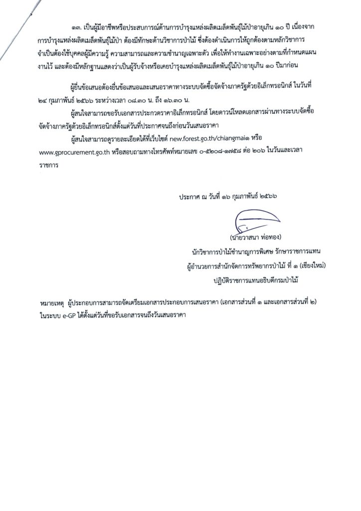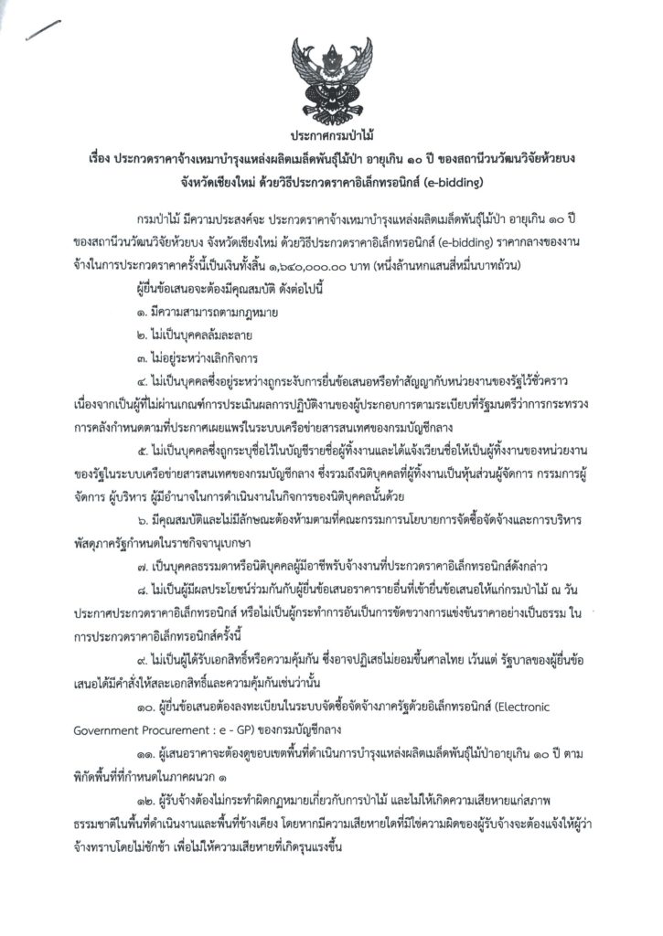 ประกาศกรมป่าไม้ เรื่อง ประกวดราคาจ้างเหมาบำรุงแหล่งผลิตเมล็ดพันธุ์ไม้ป่า อายุเกิน 10 ปี ของสถานีวนวัฒนวิจัยห้วยบงจังหวัดเชียงใหม่ ด้วยวิธีประกวดราคาอิเล็กทรอนิกส์ (e-bidding)16 กุมภาพันธ์ 2023 ใน ประกาศจัดซื้อจัดจ้าง by adminir