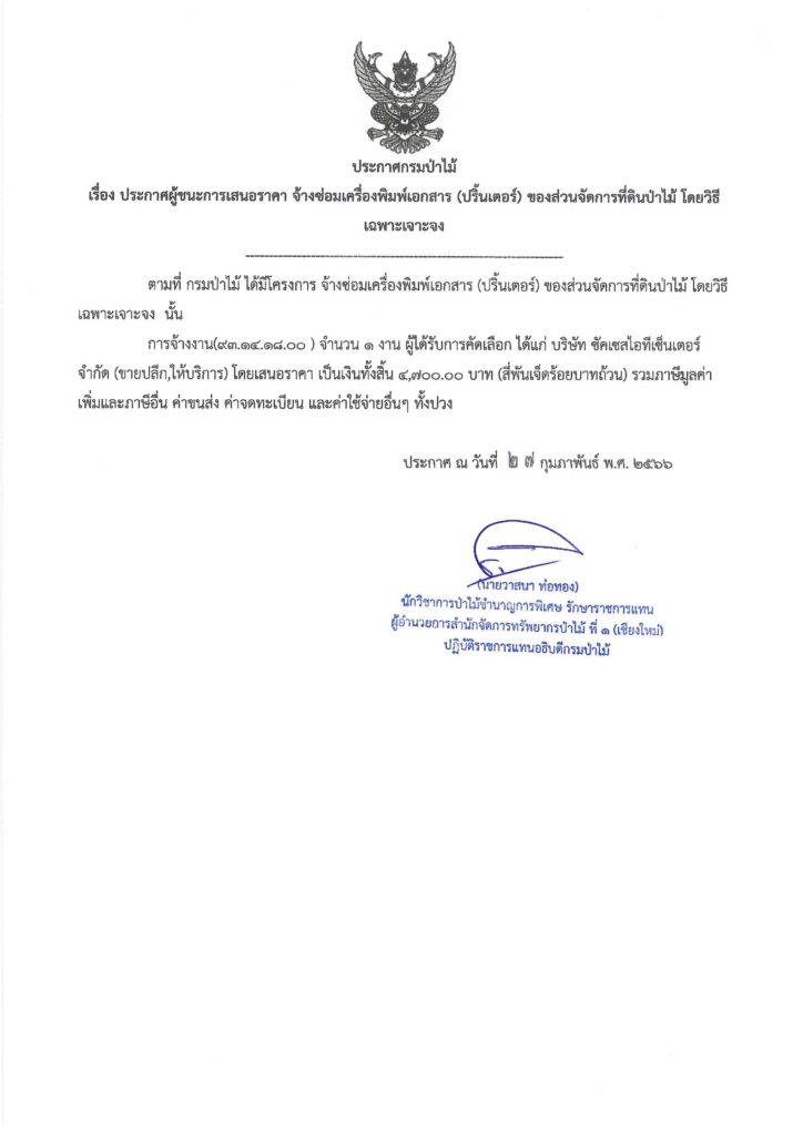 ประกาศกรมป่าไม้ เรื่อง ประกาศผู้ชนะการเสนอราคา จ้างซ่อมเครื่องพิมพ์เอกสาร (ปริ้นเตอร์) ของส่วนจัดการที่ดินป่าไม้ โดยวิธีเฉพาะเจาะจง27 กุมภาพันธ์ 2023 ใน ประกาศจัดซื้อจัดจ้าง by adminir