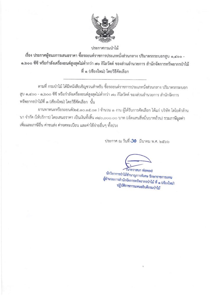 ประกาศกรมป่าไม้ เรื่อง ประกาศผู้ชนะการเสนอราคา ซื้อรถยนต์ราชการประเภทนั่งส่วนกลาง ปริมาตรกระบอกสูบ ๑,๔๐๐ -๑,๖๐๐ ซีซี หรือกำลังเครื่องยนต์สูงสุดไม่ต่ำกว่า ๗๐ กิโลวัตต์ ของส่วนอำนวยการ สำนักจัดการทรัพยากรป่าไม้ที่ ๑ (เชียงใหม่ โดยวิธีคัดเลือก10 มีนาคม 2023 ใน ประกาศจัดซื้อจัดจ้าง by adminir