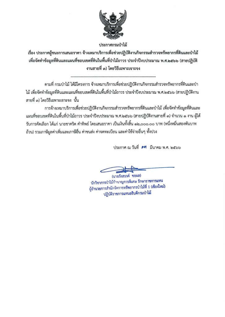 ประกาศกรมป่าไม้ เรื่อง ประกาศผู้ชนะการเสนอราคา จ้างเหมาบริการเพื่อช่วยปฏิบัติงานกิจกรรมสำรวจทรัพยากรที่ดินและป่าไม้เพื่อจัดทำข้อมูลที่ดินและแผนที่ขอบเขตที่ดินในพื้นที่ป่าไม้ถาวร ประจำปีงบประมาณ พ.ศ.๒๕๖๖ (สายปฏิบัติงานสายที่ ๓) โดยวิธีเฉพาะเจาะจง14 มีนาคม 2023 ใน ประกาศจัดซื้อจัดจ้าง by adminir