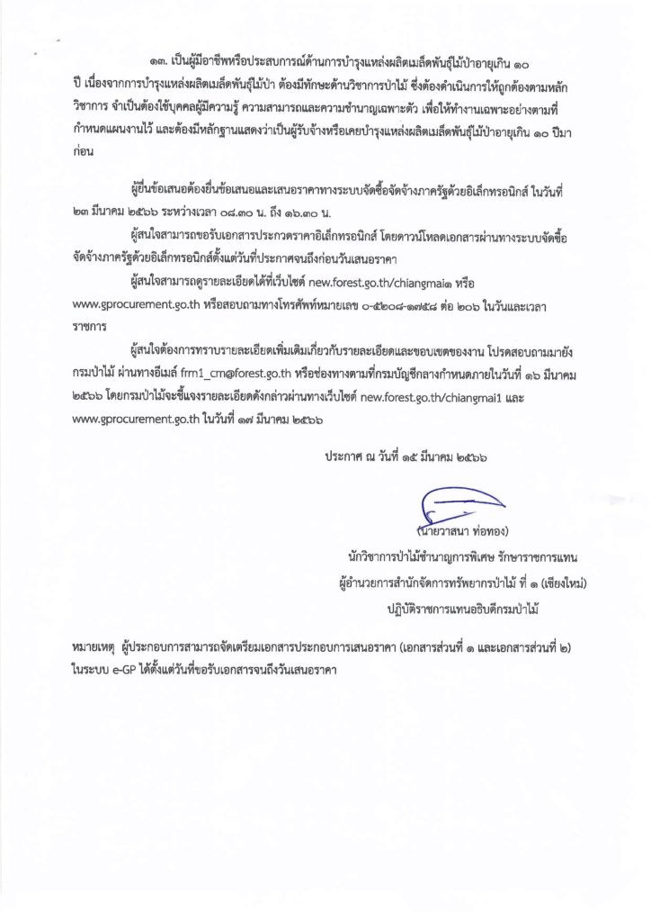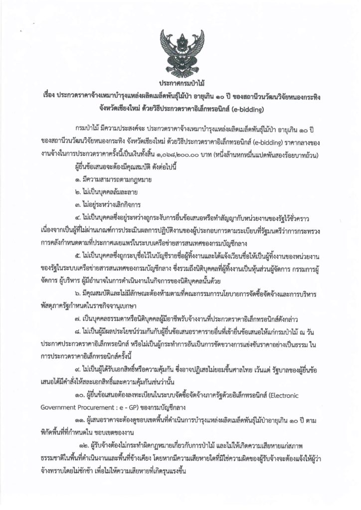 ประกาศกรมป่าไม้ เรื่อง ประกวดราคาจ้างเหมาบำรุงแหล่งผลิตเมล็ดพันธุ์ไม้ป่า อายุเกิน ๑๐ ปี ของสถานีวนวัฒนวิจัยหนองกระทิงจังหวัดเชียงใหม่ ด้วยวิธีประกวดราคาอิเล็กทรอนิกส์ (e-bidding)